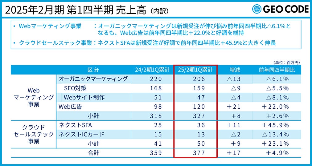 ジオコードが2025年2月期 第1四半期の決算を発表、Web広告(前年同四半期比+22.0%)、ネクストSFA(同+45.9%)が大きく伸長