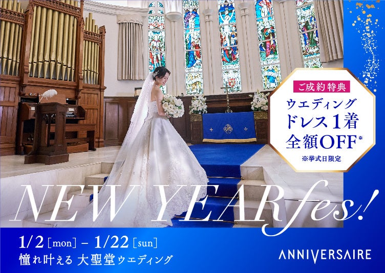 全国でゲストハウスウェディングを中心に、様々な記念日プロデュース事業を展開しているアニヴェルセル(株)は、新春限定【憧れ叶える大聖堂ウェディングフェア】を1月2日(月)から1月22日(日)まで開催いたします。