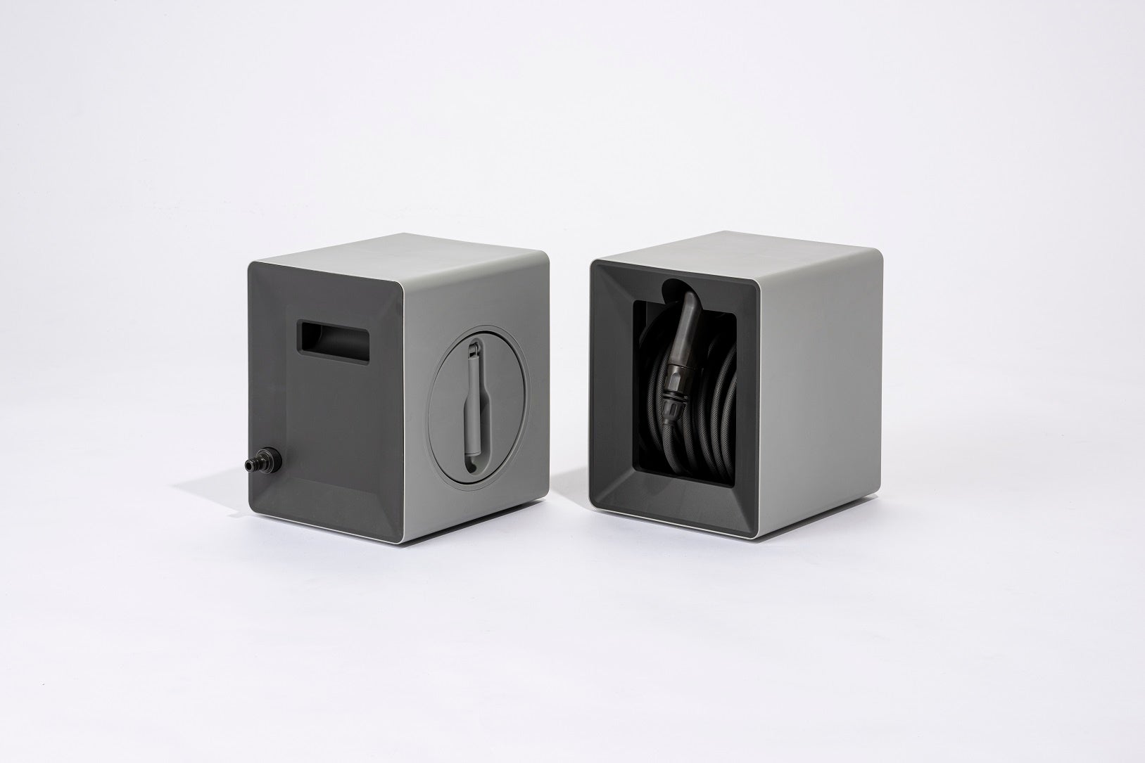 ハンドルを折りたたんで本体の側面に収納することができる、すっきりとした外観のホースリール。給水ホースを本体の背面に配置することで、コンパクトに収納することができます。ホースを巻き取りながら、同時にホースの洗浄も可能です。