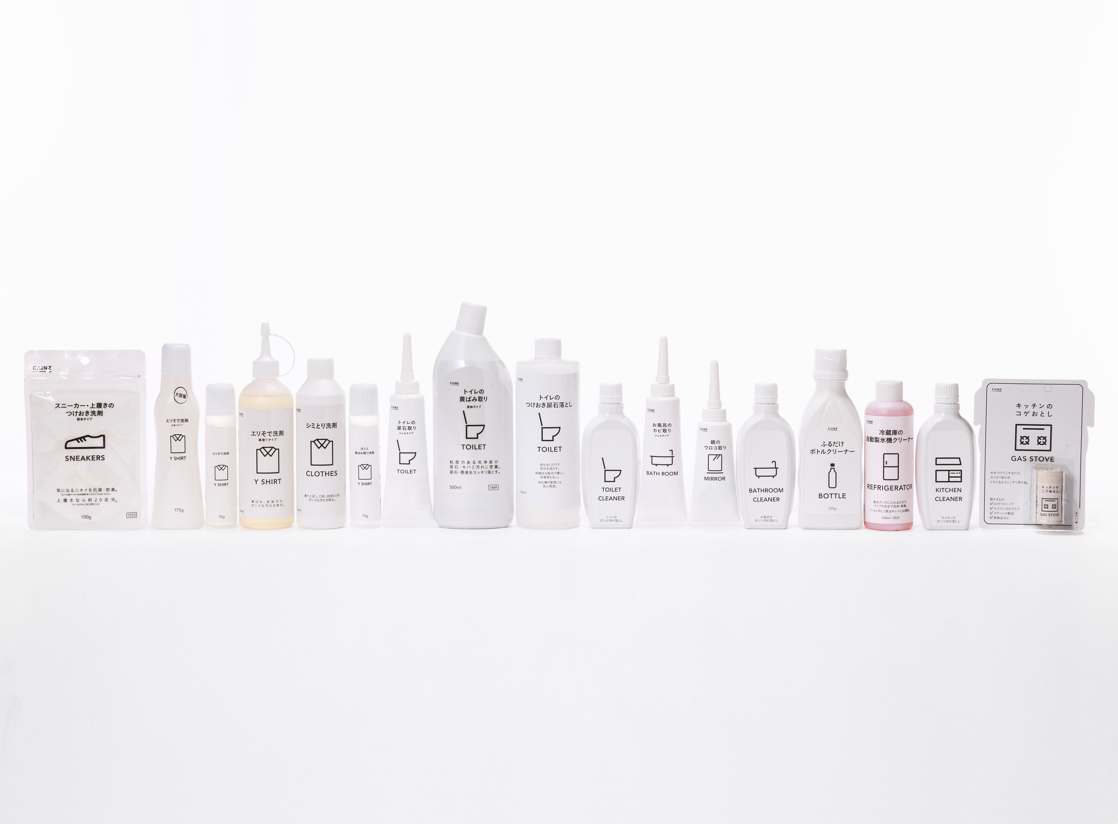 プロが使う洗剤を家庭用に使いやすくしたシリーズ。キッチン用、バスルーム用、トイレ用、洗濯用、住宅用、用途にあわせて展開しており、スプレータイプや汚れを擦るだけのスティックタイプのものなど、どなたでも簡単にご使用いただけます。視覚的に使用用途を明確にし、インテリアにも馴染むデザインとホワイトカラーで統一しました。
