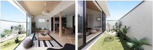 2 階リビングの延長に人工芝を敷き詰めたガーデンバルコニーとリビングが「つながる」をコンセプトにコーディネートしました。ワイドな掃き出し窓と木目が美しい勾配天井のインテリアラーチがやさしく包み込む開放的な空間を演出。内外兼用のラタンチェアやプフを取り入れ、「素材」で空間をつなげ、クロスやファブリック、テーブルやキッチンの天板にブラックを取り入れ「色」で空間をつなげています。子どもがバルコニーで遊ぶ姿、ベンチに座ってパパが本を読んであげる姿、ママが外を眺めながらキッチンでコーヒーを飲んだり・・・と家族のいろいろな姿を想像して「家族」がつながる空間づくりをしました。
