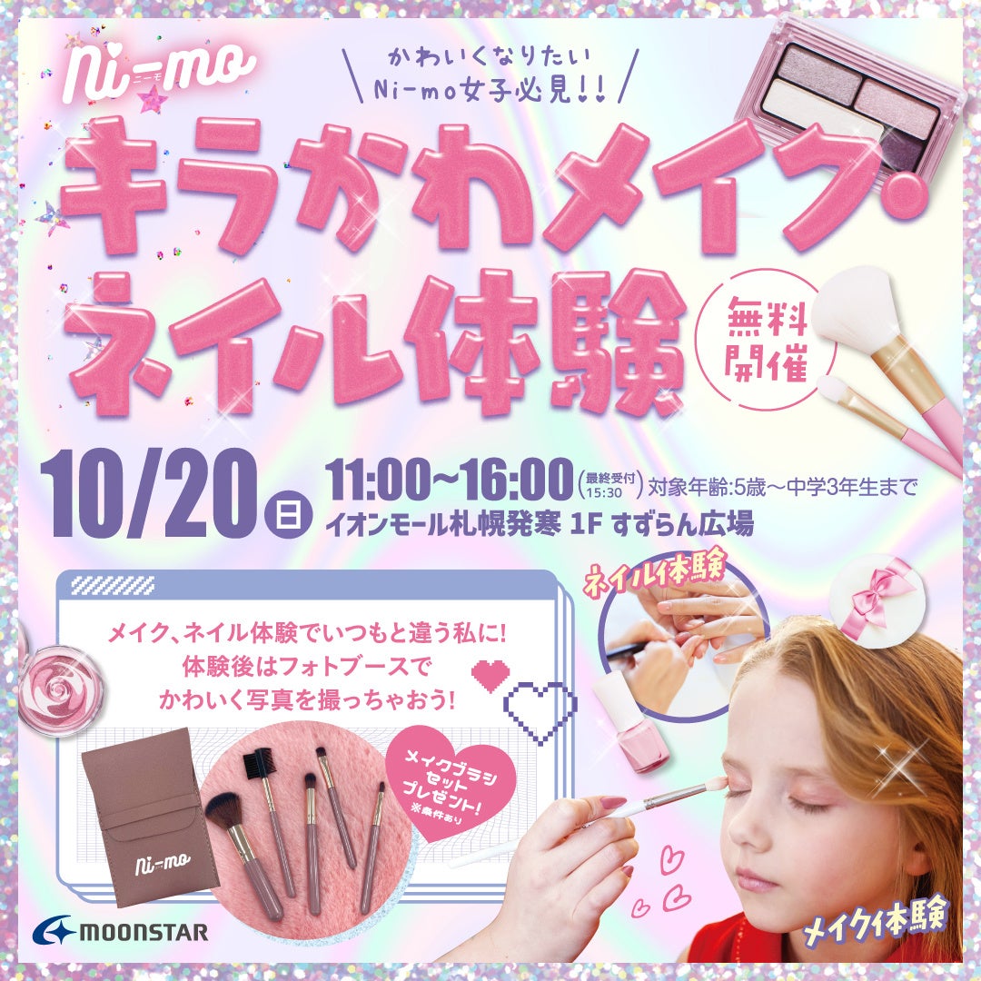 メイクのように普段とは違う特別感、ちょっと背伸びをした大人っぽい自分、そんな女の子達の憧れを叶えるアイテムとしてファッションに取り入れて欲しい!そんな願いを込めたNi-moのキャッチコピー「#足元キラかわメイク」にちなんで、参加費無料のメイク(もしくはネイル)体験イベントを開催します。今年6月に株式会社ムーンスターが本社を置く福岡県で実施したところ大変好評だった為、今回札幌でも実施する運びとなりました。ぜひお友達をお誘いあわせの上ご参加ください!