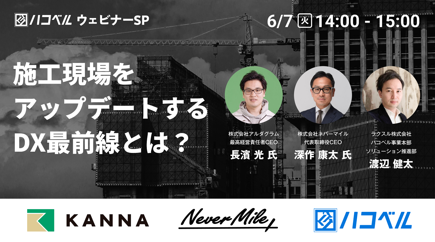 【6月7日(火)ハコベルウェビナー開催】KANNA×ネバーマイル×ハコベル対談 施工現場をアップデートするDX最前線とは?