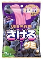 「さけるグミ」はもちっと新食感でさいて食べたり、そのまま食べたりいろいろな食べ方が楽しめるグミです。現在のラインナップはからだにやさしい乳酸菌「フェカリス菌」入りで巨峰果汁を使用した濃厚な巨峰味。友達や家族でシェアできるピロー7枚入りです。フレーバーはそのままにインパクトのある40cmのなが〜いグミ。開け口にマジックカットを採用し、簡単に開けることができます。