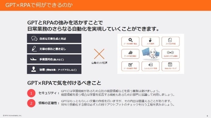 RPAホールディングス株式会社(本社:東京都港区、代表取締役:高橋 知道)の子会社で、RPA(ロボティック・プロセス・オートメーション)/Digital Labor(仮想知的労働者)のベーステクノロジーを提供するRPAテクノロジーズ株式会社(本社:東京都港区、代表取締役 執行役員社長:大角 暢之、以下「RPAテクノロジーズ」)は、GPTとRPAそれぞれの得意分野と活用事例をまとめたホワイトペーパー「事例付き3分でわかる GPT×RPAのビジネス活用」を公開しました。