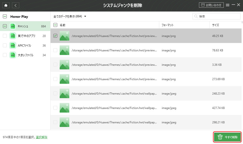 step3:DroidKitは自動的に不要なジャンクファイルやキャッシュを検出します。削除したいファイルをチェックに入れ、「今すぐ削除」をクリックします。