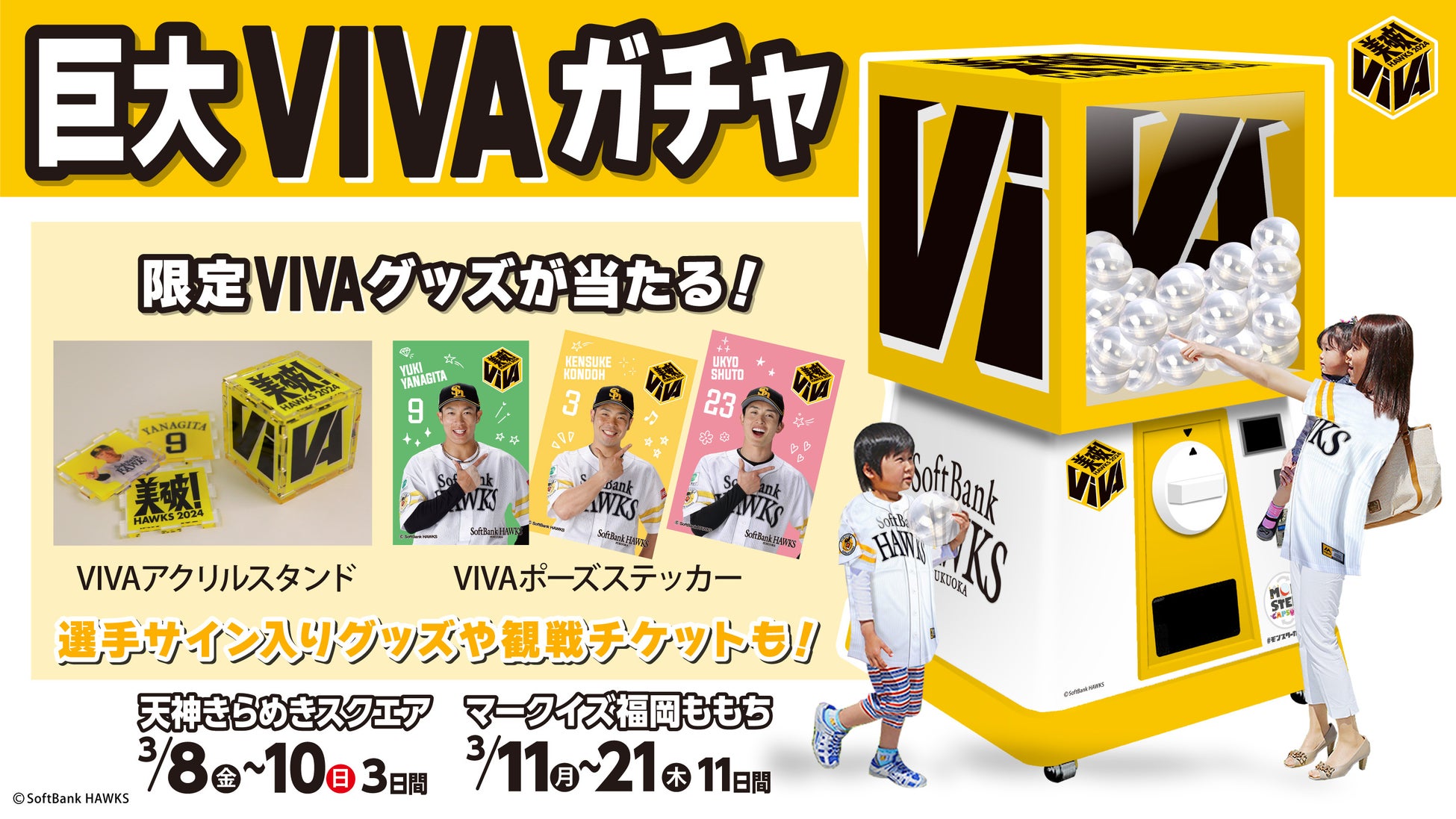 ホークスの2024年のスローガン「VIVA」ロゴをモチーフにした高さ2.5メートルのキューブ型巨大ガチャを天神きらめきスクエアとMARK IS 福岡ももちに設置し、イベントを開催します。ガチャ内のカプセルには選手サイン入りグッズや限定ノベルティなどの豪華景品が入っています。