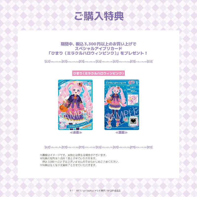 また、税込3,300円以上ご購入いただいた方には、来店特典として配布していたスペシャルアイプリカード「ひまり(ミラクルハロウィンピンク)」をプレゼントいたします。カフェにお越しいただけなかった方にもお楽しみいただける特別な企画ですので、ぜひこの機会をお見逃しなく!