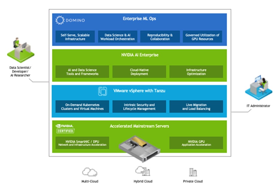 NVIDIA AI Enterprise の 1.1 リリースでは、VMware vSphere with Tanzu を使用した Domino Data Lab の Enterprise MLOps プラットフォームの検証も提供されます。この新しい統合により、より多くの企業がメインストリームのアクセラレーテッド サーバー上での研究、モデル開発、モデル展開を加速し、データ サイエンスをコスト効率よく拡張できるようになります。