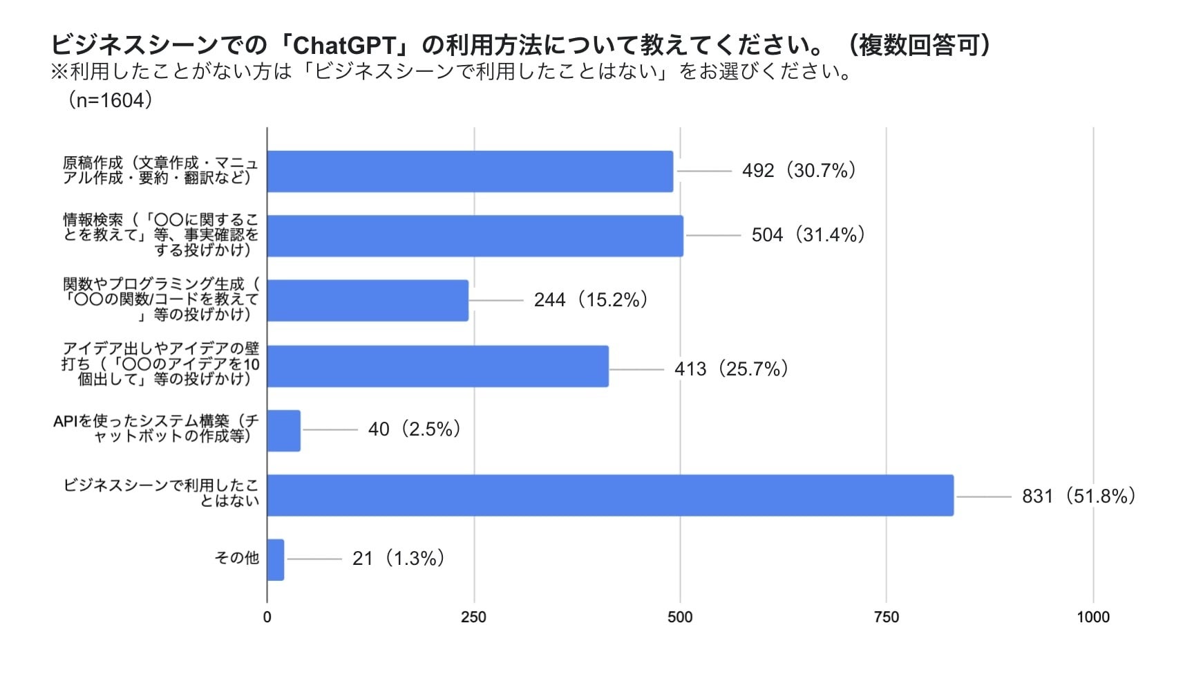 ◾️ ビジネスシーンでの利用方法は、情報検索や原稿作成などの「ChatGPT」単体での利用が多数