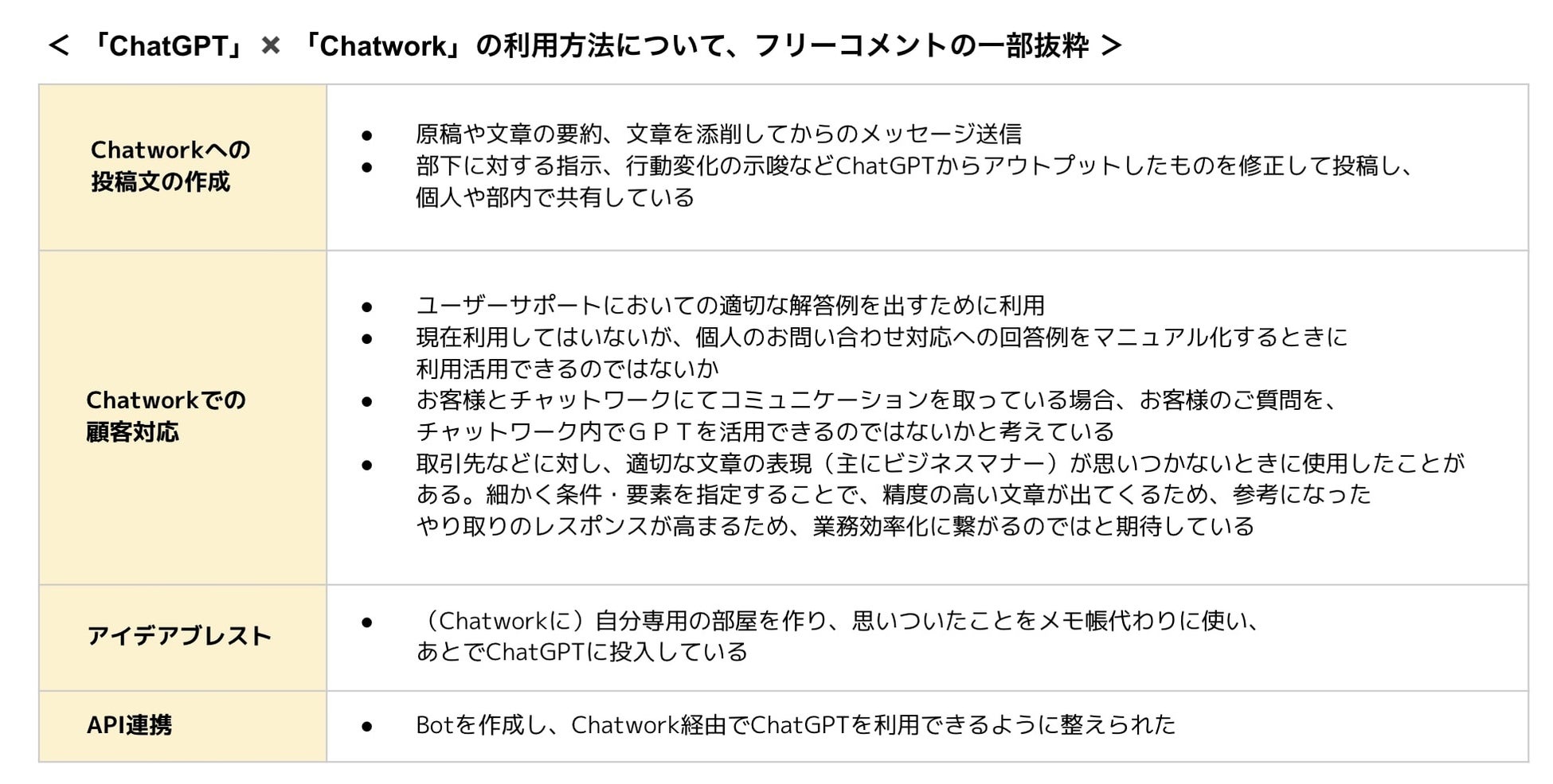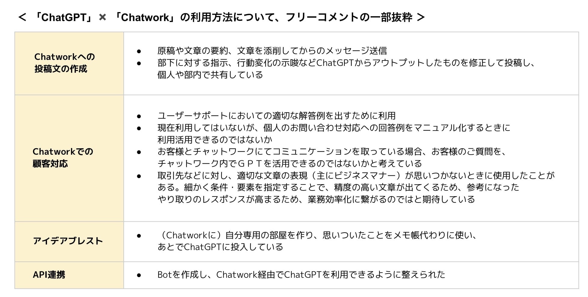 ・「ChatGPT」と「Chatwork」を掛け合わせた業務効率化については、API連携を活用しシームレスな利用で業務効率化を確立している人もいた