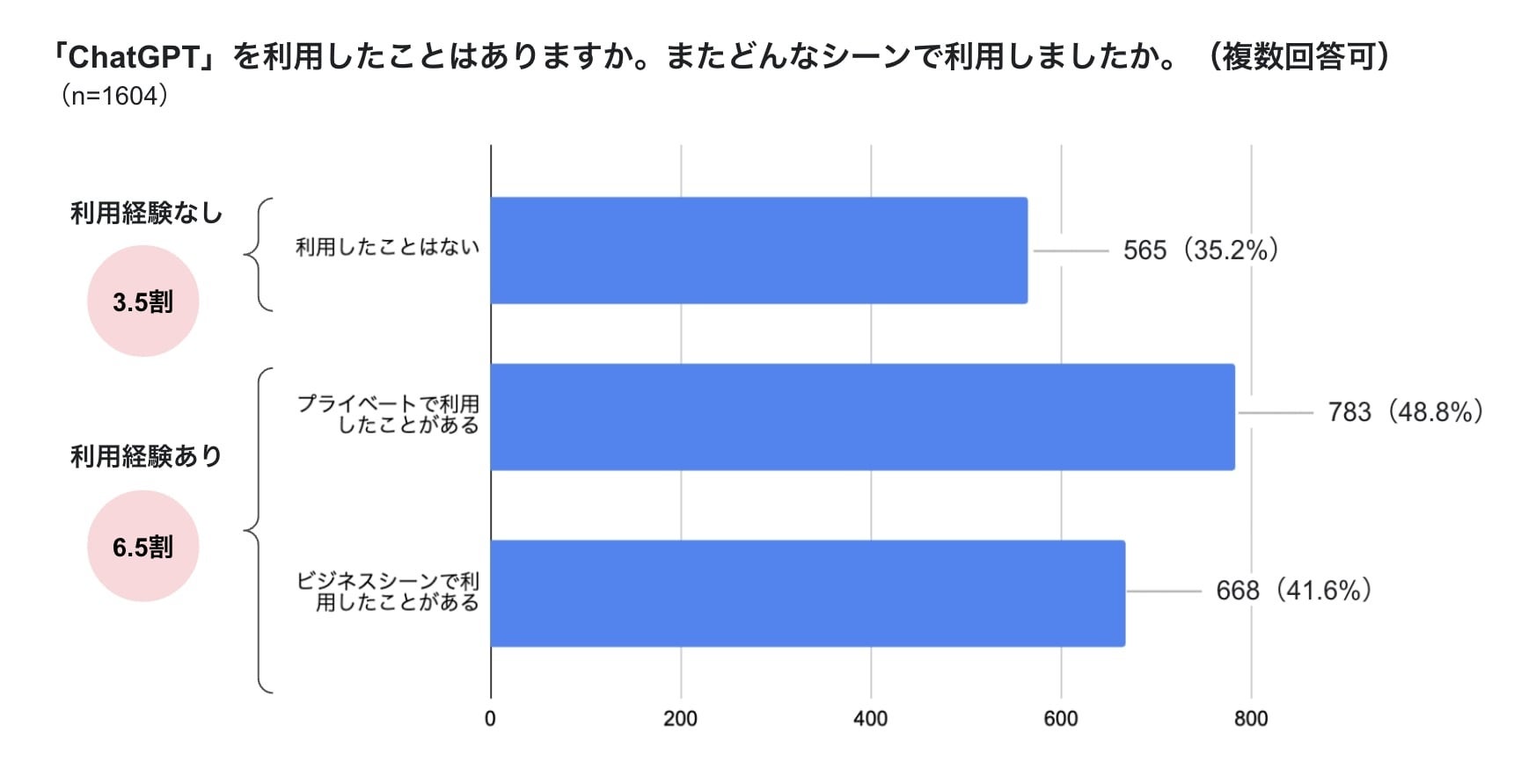 ・約5割の人がプライベートで「ChatGPT」を利用したことがあり、ビジネスシーンでの利用経験も約4割にのぼった一方で、3割強の人は利用経験がない