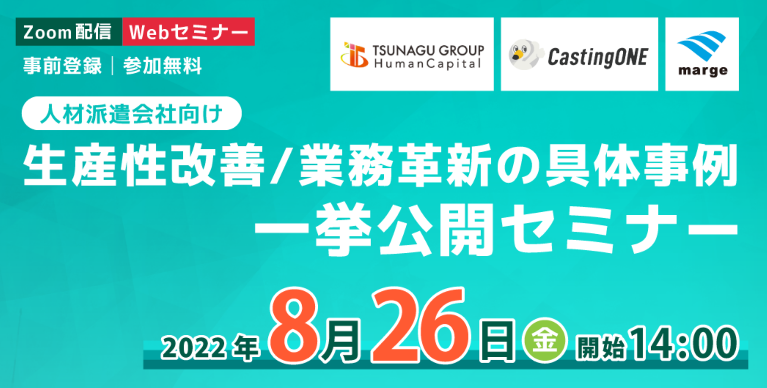 【8/26(金)14:00~】人材派遣会社様向け無料Webセミナー! ~生産性改善/業務革新の具体事例一挙公開セミナー~