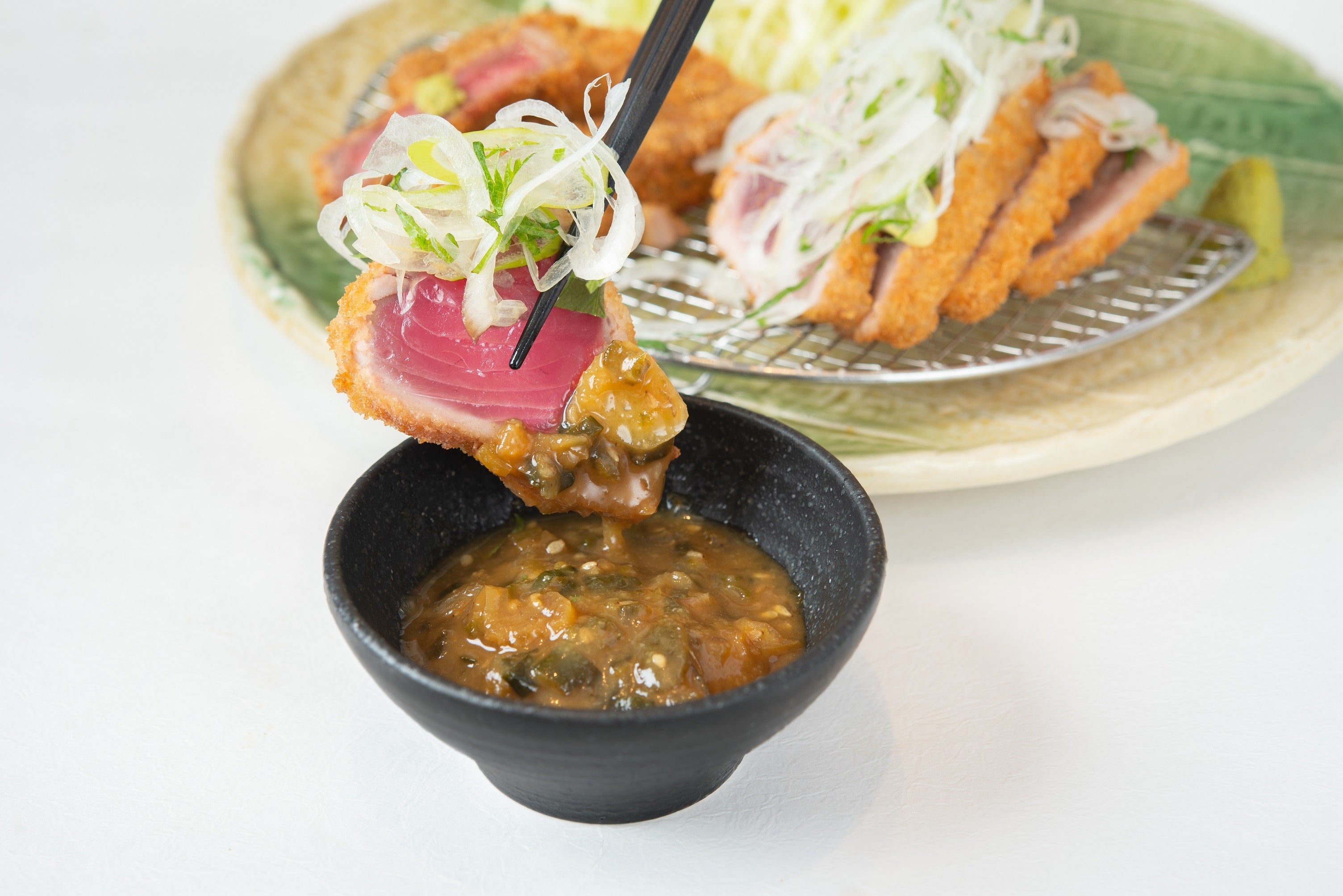 鰹の旨みを引き立てる特製の「ピリ辛にんにく味噌」とさっぱり「4種の薬味」を合わせてお召し上がりいただきます。その他にも定番の「だし醤油・山椒塩・牛カツソース」と合わせても美味しくお召し上がりいただけます。豊富な薬味とつけだれで、様々な組み合わせをお楽しみください。