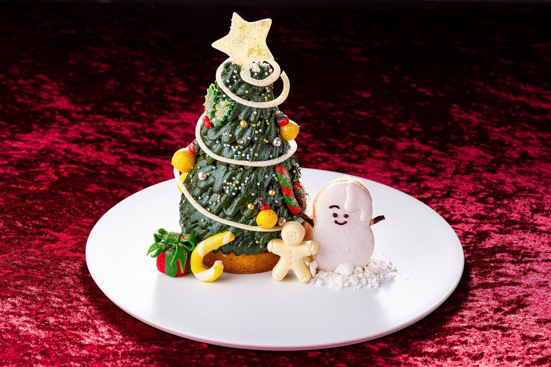 ピスタチオと抹茶のバタークリームに包み込まれたツリーの中には、ヘーゼルナッツ&ピスタチオのコク深いクリーム、しっとりビターなチョコスポンジ、バラ香るクリーム&甘酸っぱいダークチェリーのコンポートを何層にも重ねリッチな味わいに。土台にもダークチェリ―とアールグレイのクラフティ―を敷き、贅沢に愉しめるフォレノワールです。