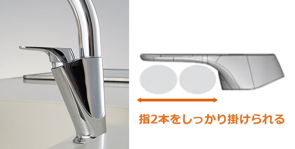 温度や流量を調節するハンドルの長さを長くし、指2本がしっかりと掛けられる長さに。細かな微調整がしやすくなりました。