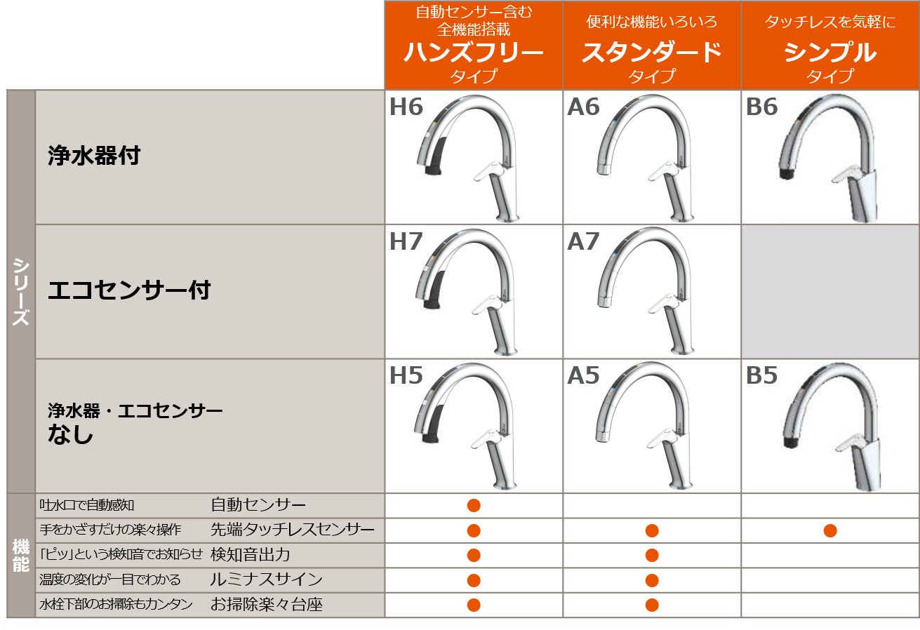 多岐にわたり多様な機能を持ち合わせるナビッシュ。たくさんあってどれを選んだらよいかわからない、という方に向けて、自動センサー含む全機能を搭載したハンズフリータイプ、便利な機能を標準装備したスタンダードタイプ、気軽にタッチレス水栓を導入いただけるシンプルタイプの3タイプにバリエーションを分け、より選びやすくなりました。