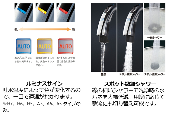 新モデルには、エコハンドルを標準装備。ハンドル位置が正面にあるときは水が出るエコハンドルは、お湯が混合する位置にひねるとカチッとクリック音でお知らせするので、無駄なお湯の使用を低減できます。(節湯C1対応:https://japan-valve.org/cms/wp-content/uploads/2022/11/2211_A-1_setsuyu-sessui_2211.pdf)