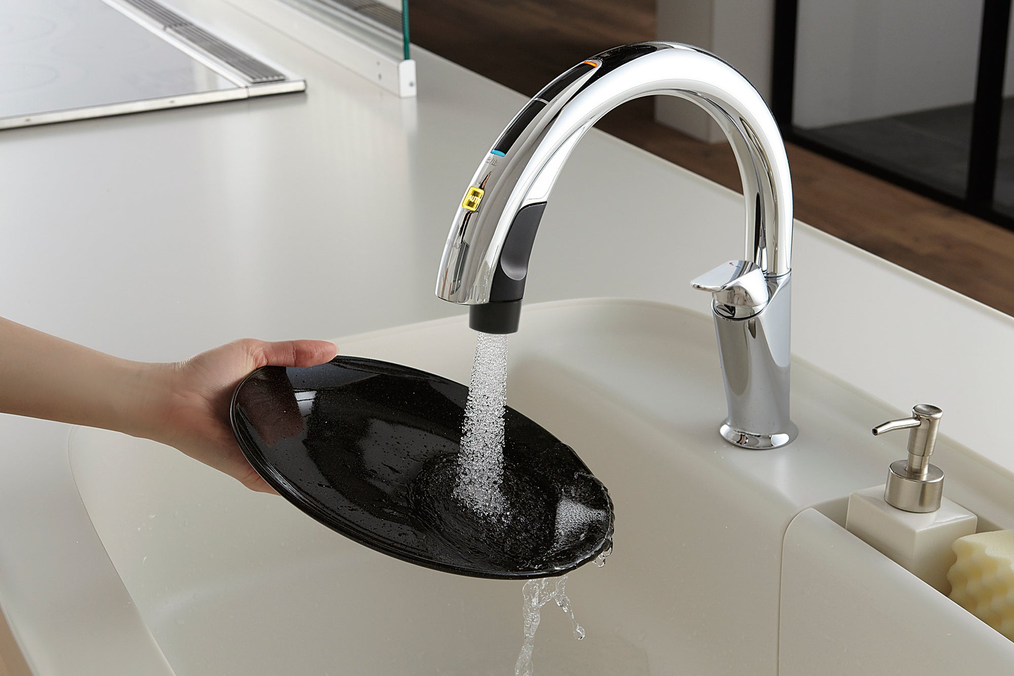 操作は吐水先端のセンターに手をかざすだけ。汚れた手でも触れずにラクラク操作できます。また、操作時に検知音が出るタイプでは、耳でも操作を確認できます。