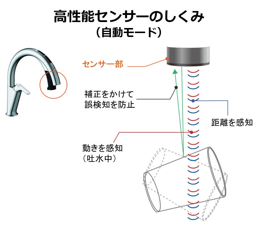 高性能センサーにより、「黒い物」「鏡面の物」「透明の物」など、これまでのセンサーでは感知しづらかった物に対しても、感知精度が向上しました。