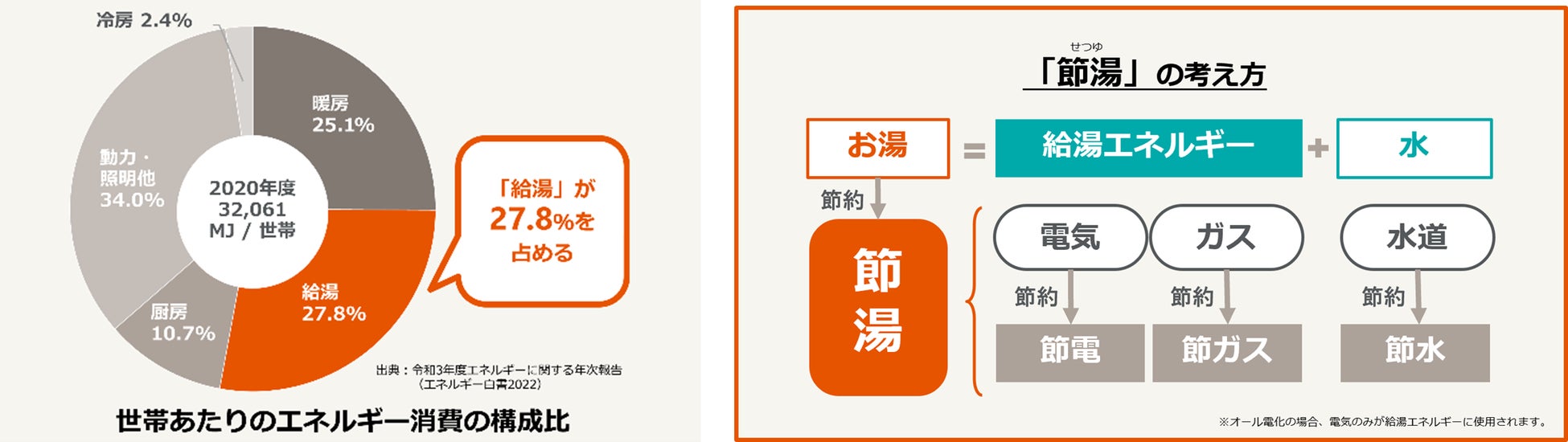 家庭でのエネルギー消費量の約28%を占める「給湯」。給湯のためのお湯を沸かす際には、電気とガス両方(※オール電化の場合は電気のみ)のエネルギーを使用しています。そのため、お湯の利用を見直して「節湯」することが、電気代、ガス代の節約および環境負荷の低減にも繋がります。エコハンドルにより、普段不用意にお湯を沸かしてしまっていないか意識することが重要です。