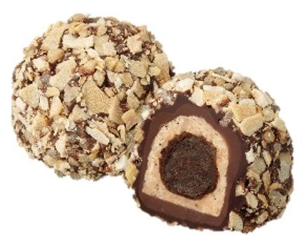 ダークチョコレートアーモンドガナッシュにアーモンドプラリネを重ね、ミルク&ダークチョコレ―トで包み、アーモンドフレークを飾りました。アーモンドづくしの香ばしいひと粒です。