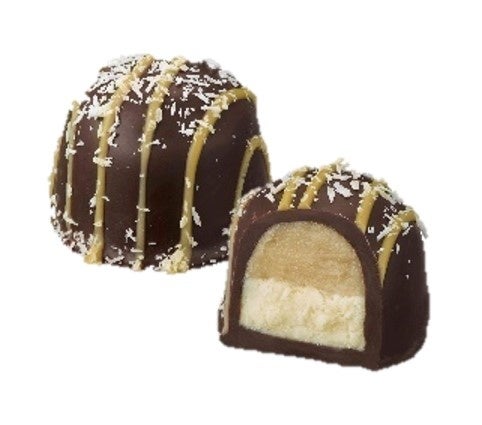 トロピカルで爽やかな酸味が楽しいパッションフルーツ入りのガナッシュに、ココナッツとライスパフが入ったムースを重ね、ダークチョコレートで包み、イエローラインとココナッツフレークで飾りました。エキゾチックな味わいが口いっぱいに広がります。