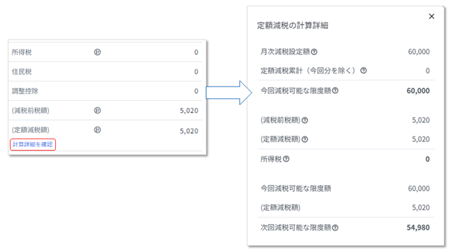 給与(賞与)明細画面での定額減税の自動計算が可能となりました。新たな明細項目として、減税前税額・定額減税額・減税設定額が6月以降の給与(賞与)手続きに表示されます。また、「計算詳細を確認」をクリックすると「定額減税の計算詳細」ウインドウが開いて、内容を確認できます。