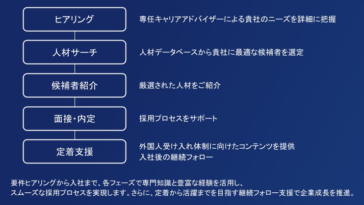 即戦力となる外国人の紹介だけではなく、採用から定着までをワンストップでサポートします。