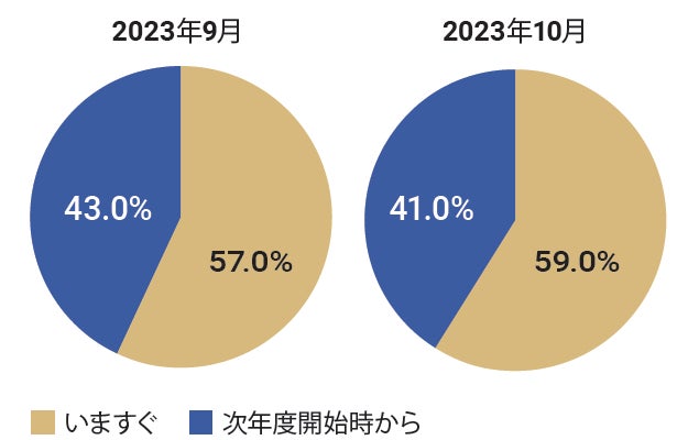 保育士バンク!の利用実績をもとに、当月の園の募集要件で、入職する タイミングが「いますぐ」なのか「次年度開始時」なのかの割合を算出、 前月と比較。