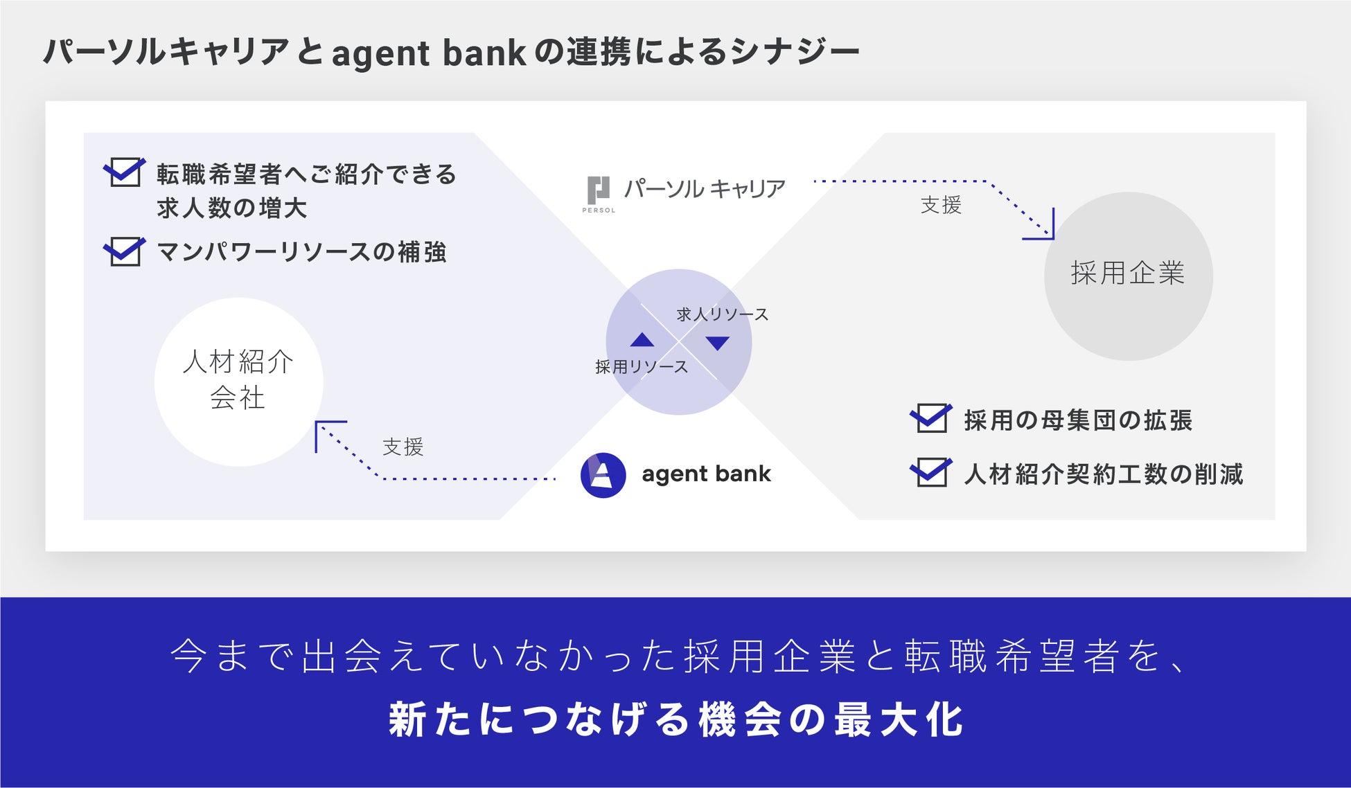パーソルキャリア社の有する豊富な求人情報を、「agent bank」のプラットフォームを通じてより多くの人材紹介会社様にお届けすることで、転職希望者と求人企業のマッチング機会を最大化することができる革新的な連携を、ついに実現することができました。人材紹介事業に関わられている全ての方々に、価値あるサービスを提供できるよう、引き続きパーソルキャリア社と更なる連携強化を図り、サービス改善を重ねてまいりたいと思います。