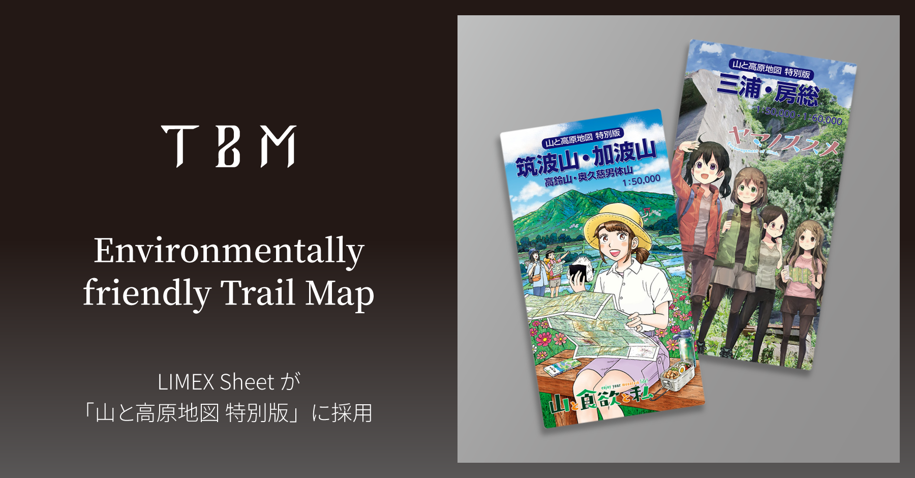 株式会社TBM(本社:東京都千代田区、代表取締役CEO:山﨑敦義、以下TBM)の石灰石を主原料とする「LIMEX Sheet(ライメックスシート)」80μmが、株式会社昭文社ホールディングス(本社:東京都千代田区、代表取締役社長:黒田茂夫)とその子会社である株式会社昭文社(本社:東京都千代田区、代表取締役:川村哲也、以下昭文社)が発売する、『山と高原地図 特別版』の「筑波山・加波山」および「三浦・房総」の2点に採用されました。人気登山マンガ『山と食欲と私』と『ヤマノススメ』の登場人物たちの描き下ろしイラストがパッケージに使用された商品で、2022年8月25日より全国の主要書店で発売されます。