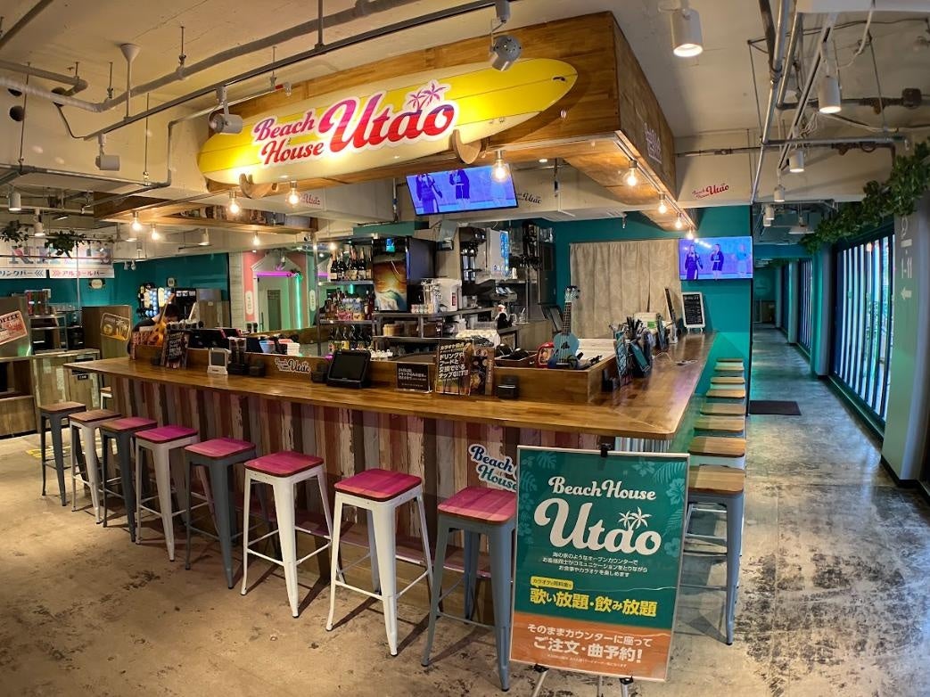 あたかも海の家にいるかのようなオープンカウンター「Beach House Utao」ではカラオケはもちろんBARやカフェとしてもご利用いただけます。