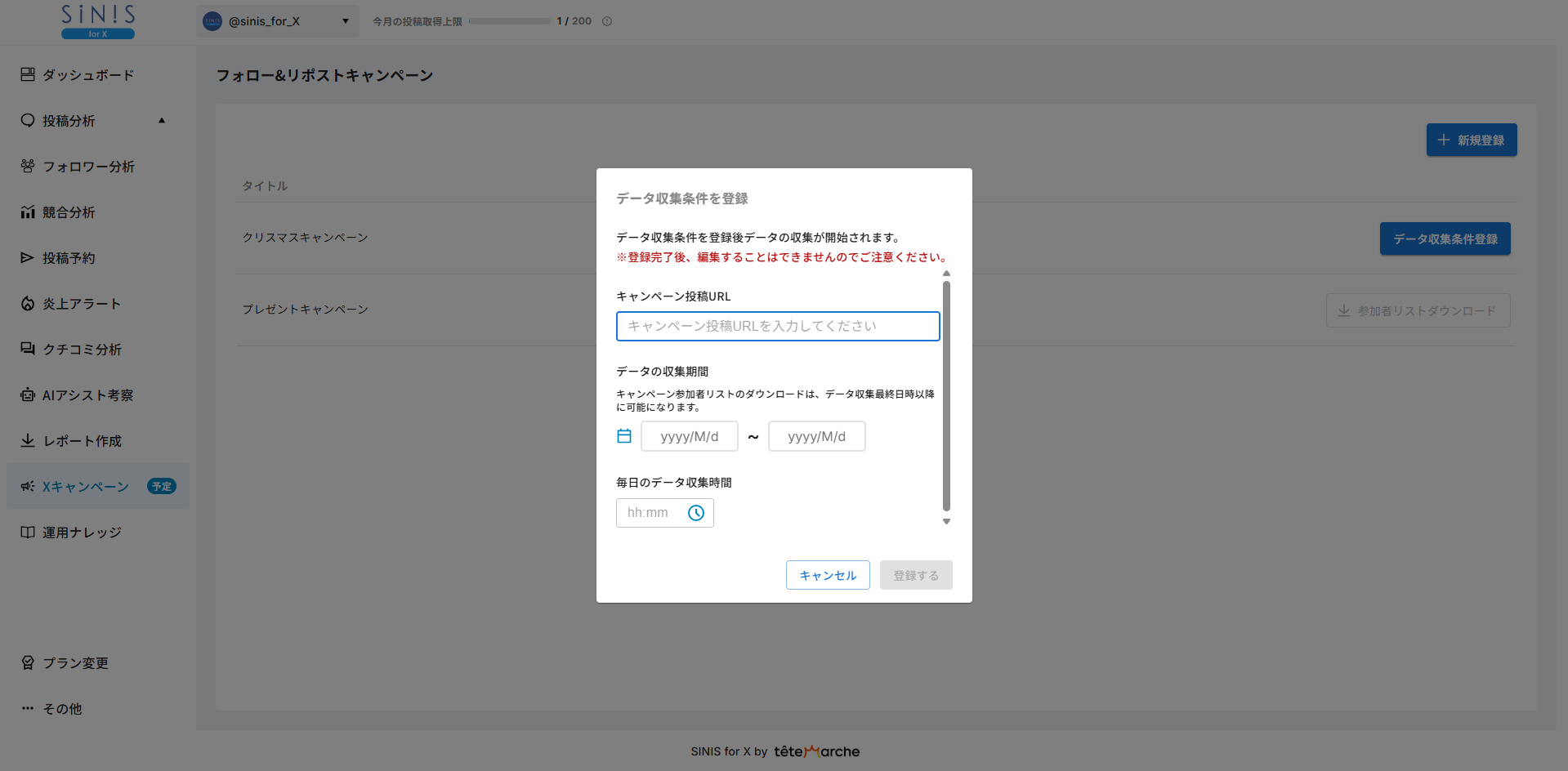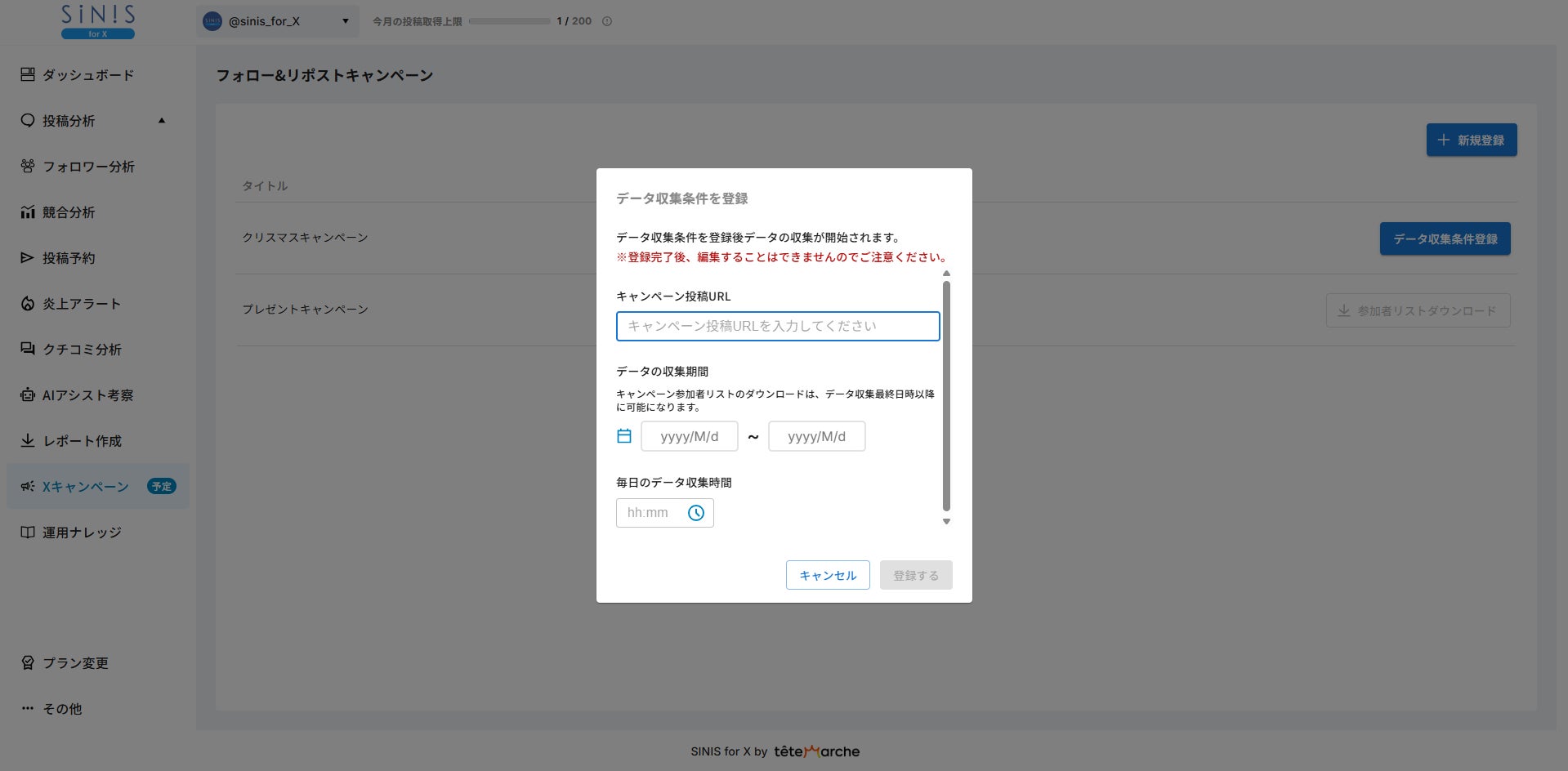 企業向け SNSマーケティング支援を中心としたビジネス展開をするテテマーチ株式会社(本社:目黒区、代表取締役:上田 大介)が運営するX分析・運用支援ツール「SINIS for X(サイニスフォーエックス)」は、X(旧Twitter)上で実施されるフォロー&リポストキャンペーンに特化した新機能「フォロー&リポストキャンペーン機能」を2025年12月23日(火)に提供いたします。