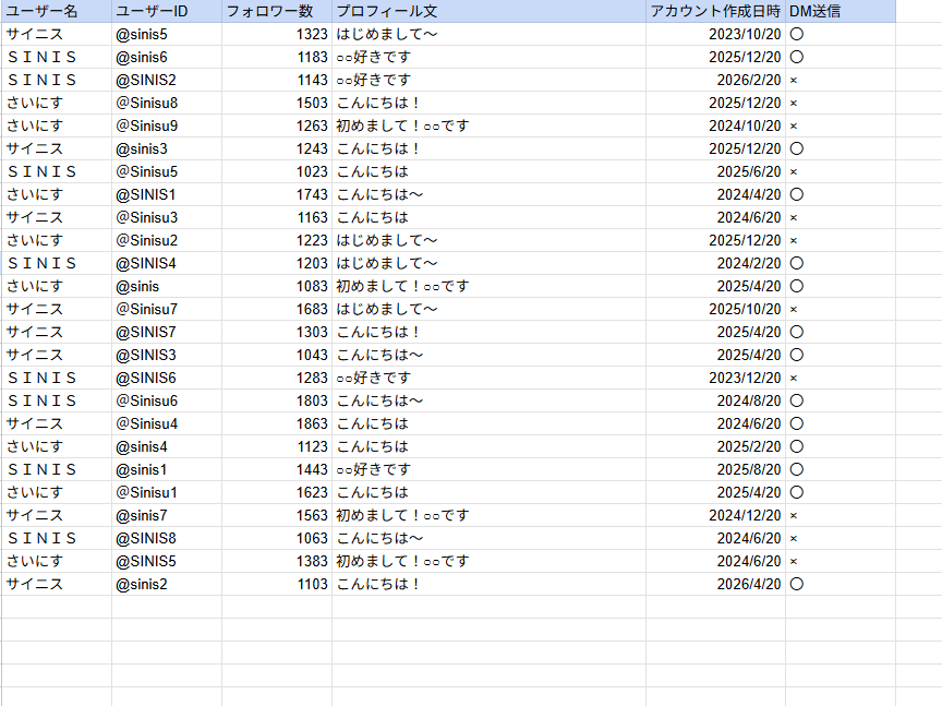 ユーザー名、プロフィール文、フォロワー数、アカウント作成日時、DM送信可否など、分析や当選連絡に必要となる主要項目を収集します。