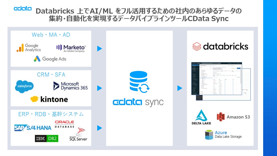 Databricks 上でAI / ML をフル活用するための社内のあらゆるデータ(MA・CRM・SFA・ERP)の集約・自動化を実現するデータパイプラインツールCData Sync