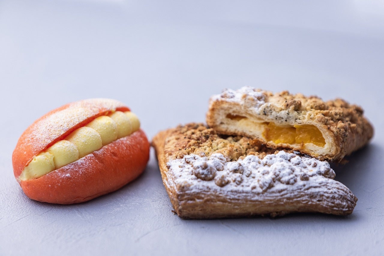 マンゴーじゃりパンと、鎧塚俊彦シェフ監修の「オムレットマンゴー」をご用意しました。オムレットマンゴーは、マンゴーとチーズ入りカスタードクリームをクロワッサン生地で包み込み、表面に紅茶を纏わせた、マンゴーの甘みを一層引き立てる逸品です。マンゴーじゃりパンは宮崎で人気の「じゃりパン」をマンゴーでアレンジした、爽やかな甘さとコロンとした愛らしい見た目が魅力のパンです。