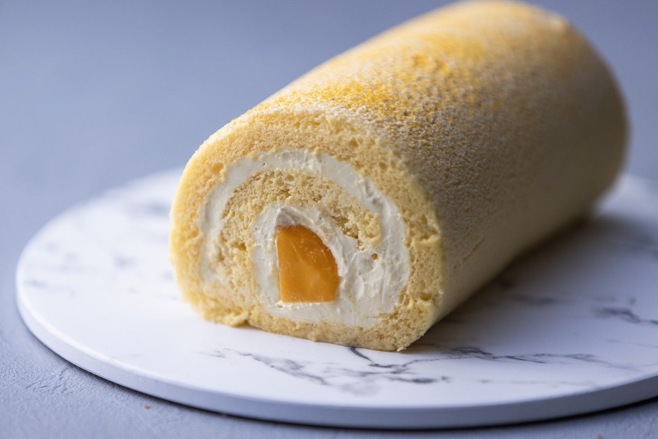 エグゼクティブ シェフ・パティシエ日吉の名を冠したロールケーキ。宮崎県産マンゴーの果肉とマスカルポーネチーズのクリームを、マンゴーパウダーで色鮮やかに仕上げたふんわり生地でロールしました。