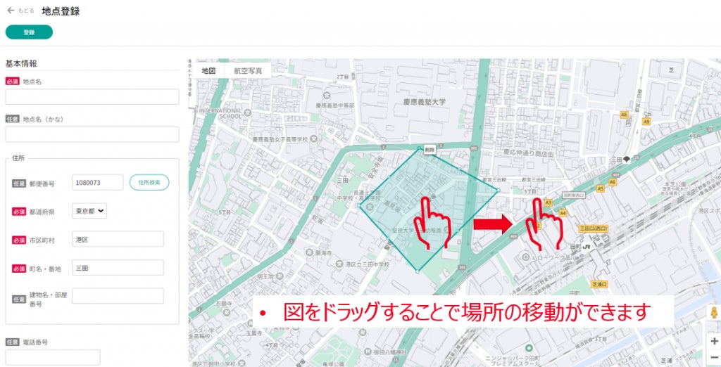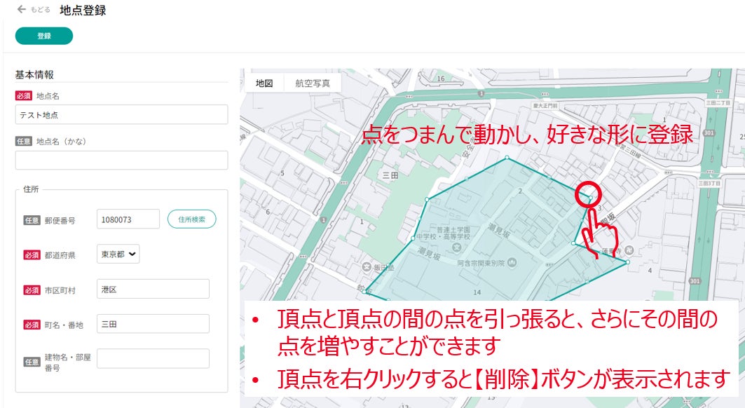 多角形エリアの頂点の追加・移動は、マウスカーソルのドラッグ操作で直感的に行えるため、PC操作に不慣れな方でも問題なくご利用いただけます。