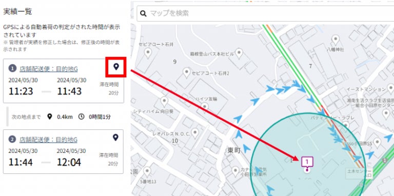 MOVO Fleetのジオフェンス機能(自動着荷機能)は、事前の地点登録により、その地点に着荷したか否かを自動判定し、配送完了時間や、その地点滞在時間を記録する機能です。