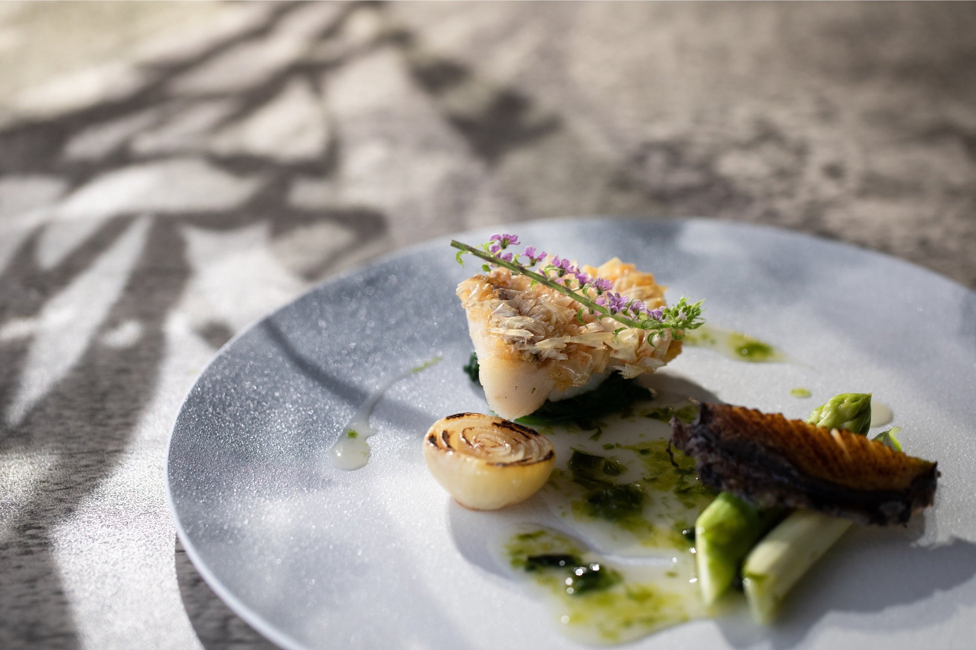 ・魚料理:甘鯛のうろこ焼き あおさ海苔のソース 花穂紫蘇の薫り