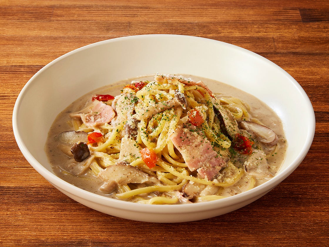 しめじ・エリンギ・椎茸とベーコン・セミドライトマトをトッピングし、香り高いポルチーニ入りのクリームソースと合わせました。リニューアルしたもちもちの生パスタにソースがよく絡みます。