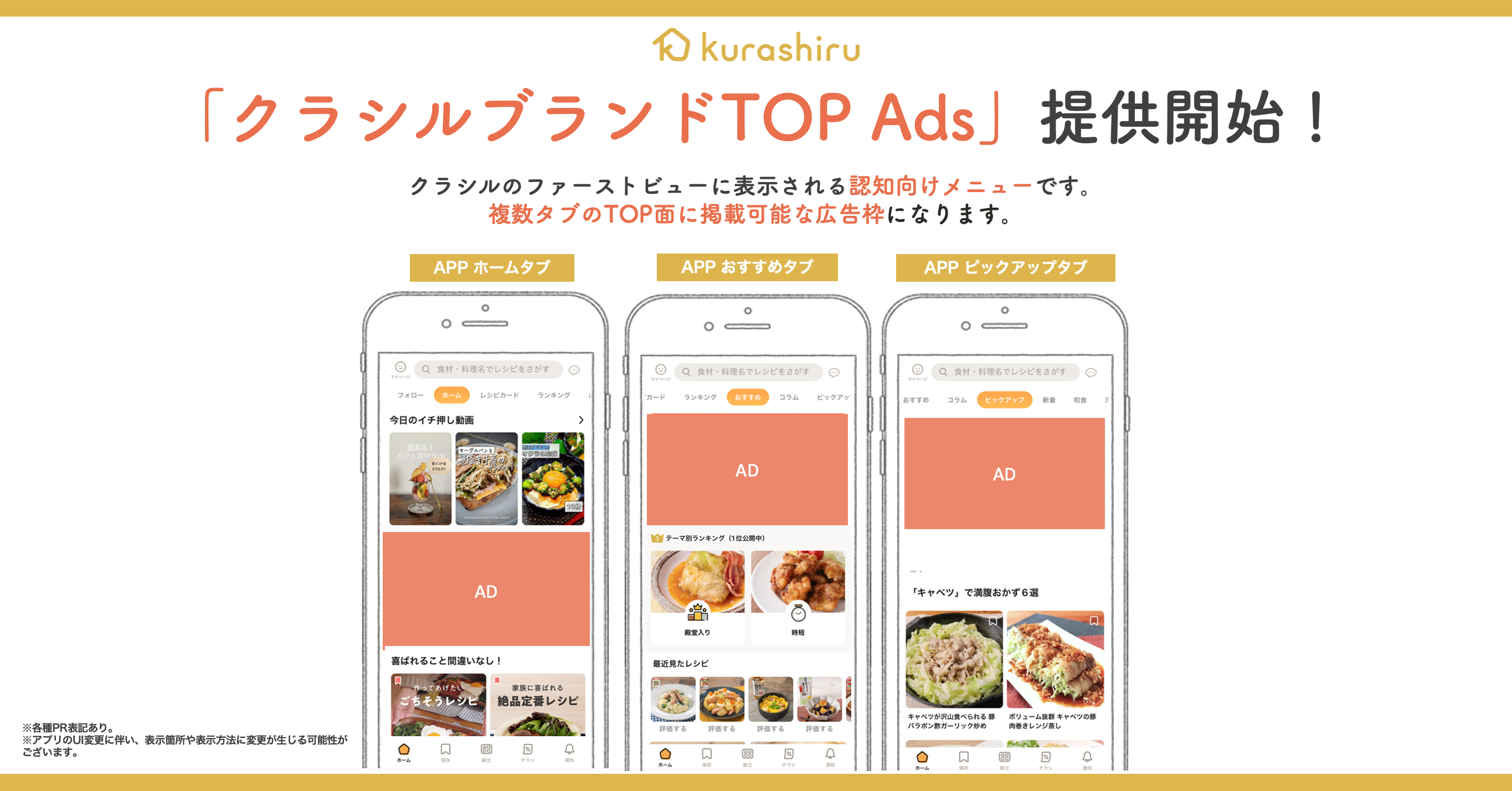 国内No.1のレシピプラットフォーム「クラシル」(※1)は、8月5日(金)より、新たな広告プランとして「クラシルブランドTOP Ads」の提供を開始します。