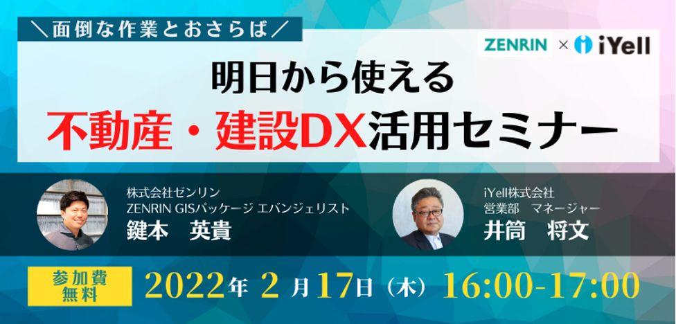 住宅ローンテックベンチャーのiYell株式会社(本社:東京都渋谷区、代表取締役社長兼CEO:窪田光洋、以下「iYell」)は、株式会社ゼンリン(本社:福岡県北九州市、代表取締役:髙山 善司、以下「ゼンリン」)と、不動産・建設業界向けの無料ウェビナー「\面倒な作業とおさらば/ 明日から使える不動産・建設DX活用セミナー」を、2月17日(木)16:00より共催いたします。
