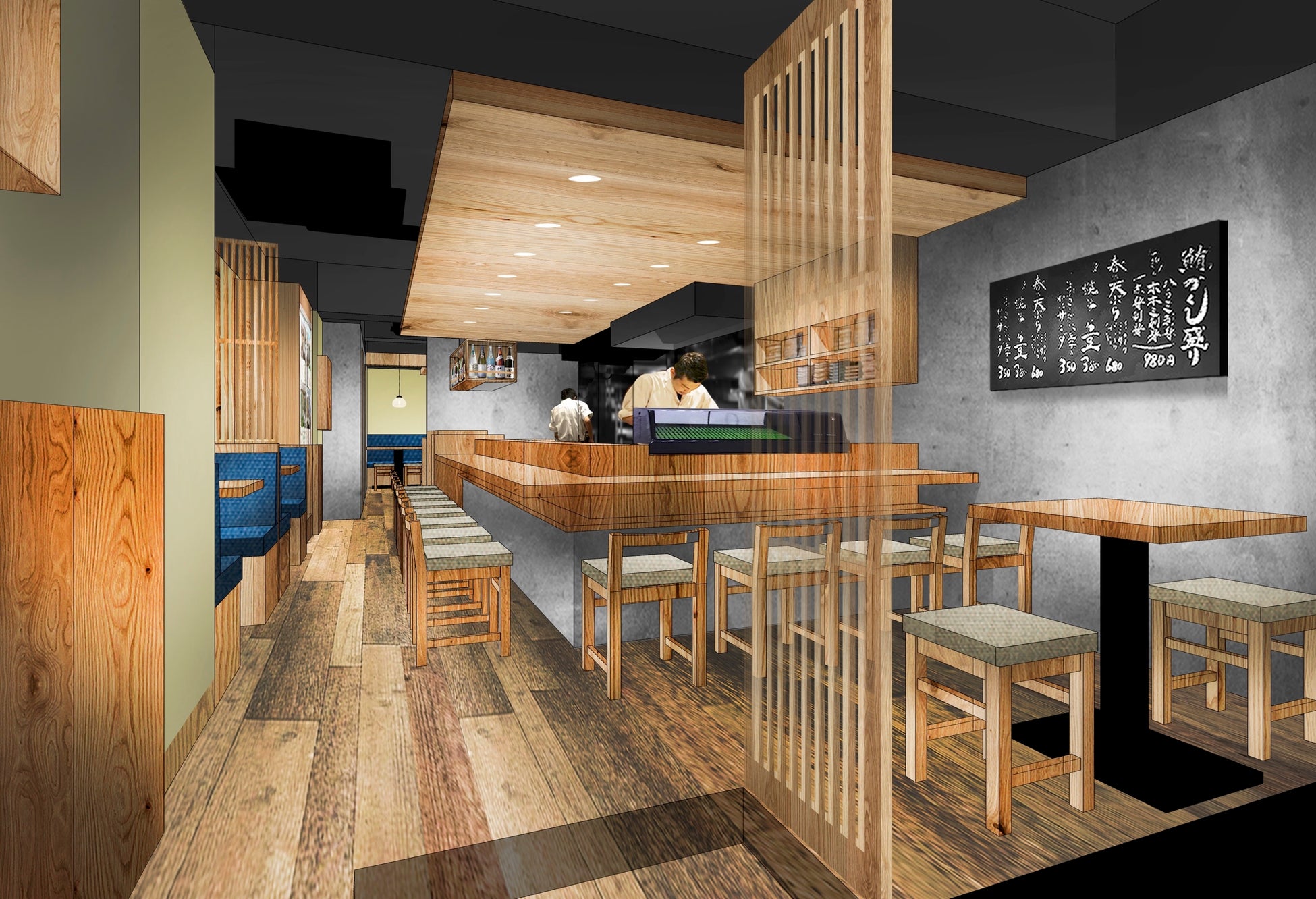 店内は白木を基調とした和の趣ある落ち着いた空間に仕上げ、カウンター席やテーブル席など、ご利用人数や用途によって使い分け可能なお席をご用意しております。