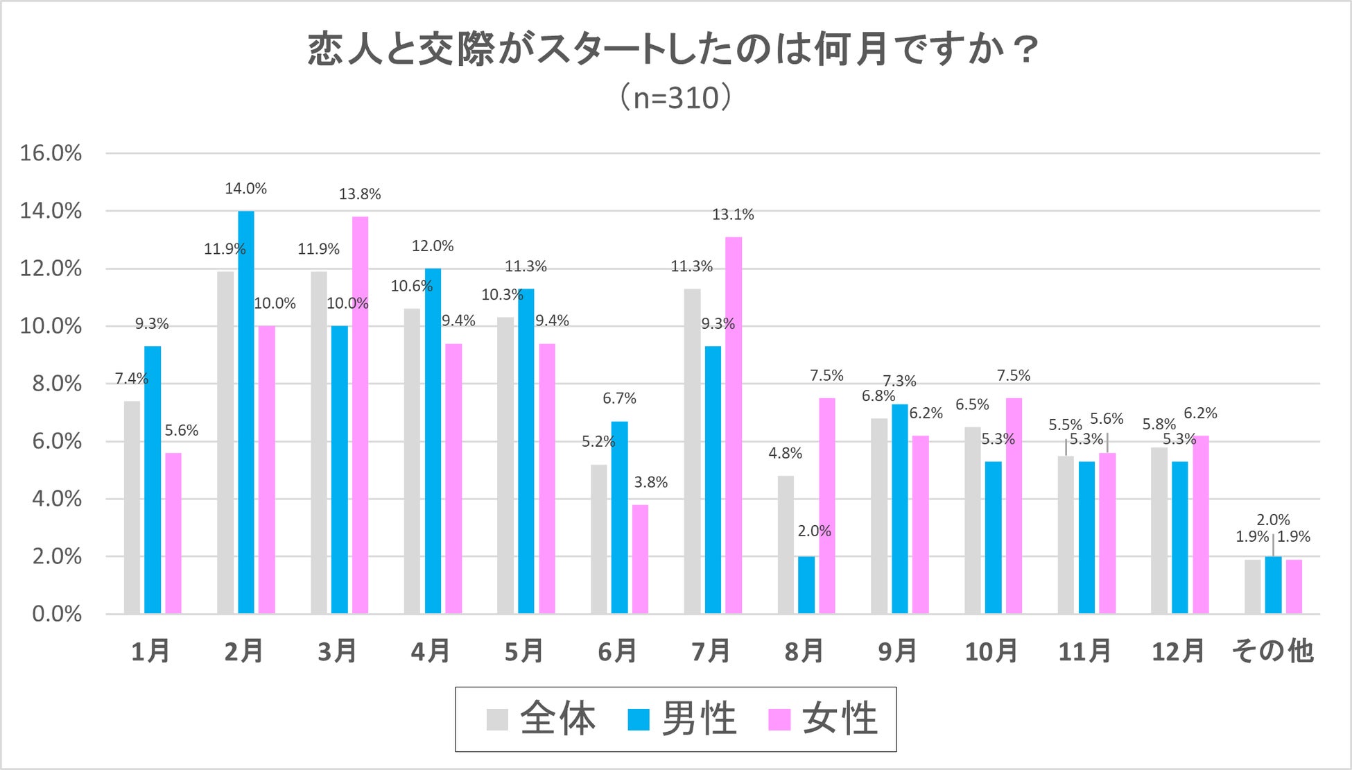 最後の設問では25~34歳のお付き合いをしている恋人がいる男女310人に、交際が開始したのが、一年のうち<何月>だったかについて伺ってみました。