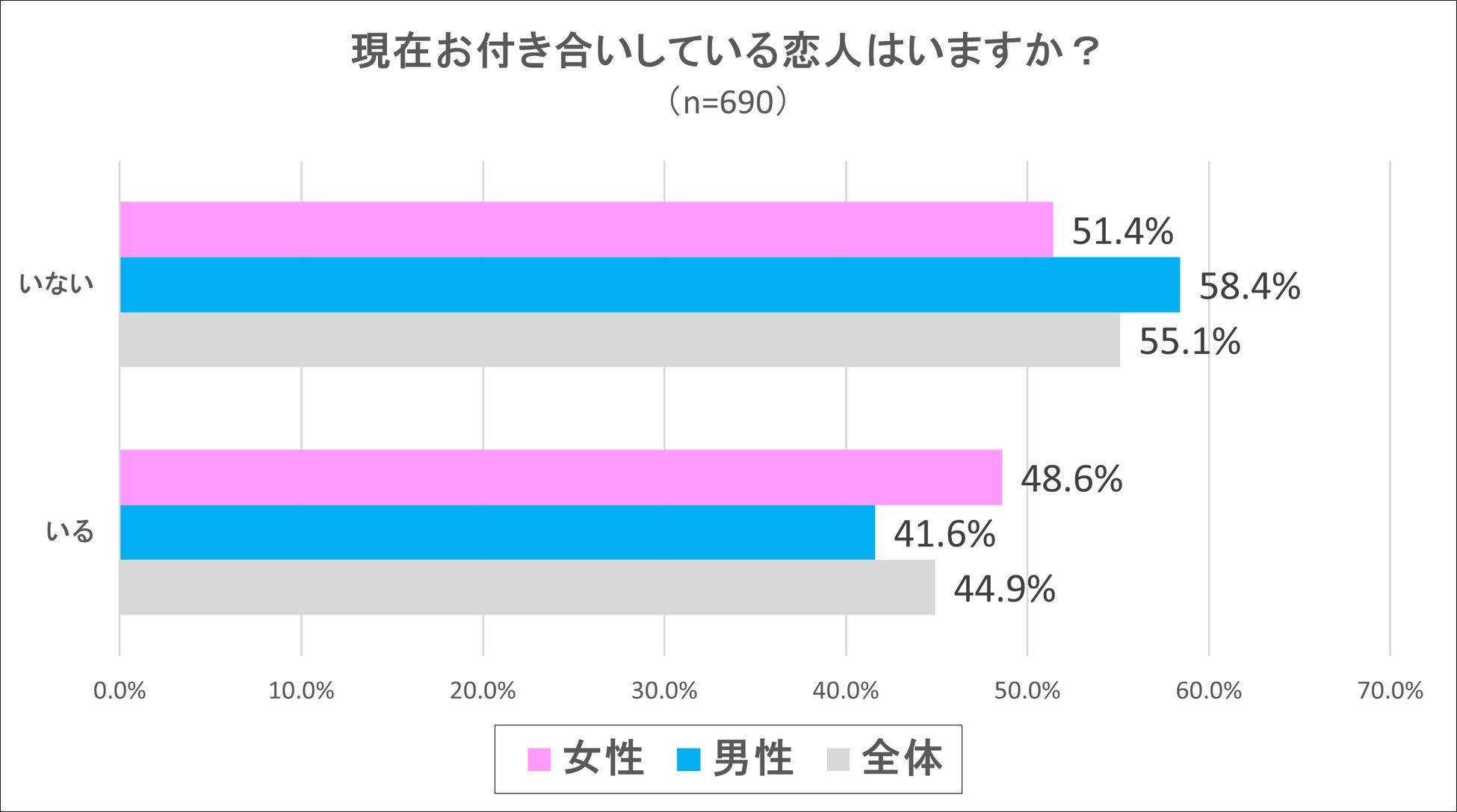 まずアンケート対象となる25~34歳独身男女690人に、「あなたは現在お付き合いをしている恋人がいますか?」と伺ったところ、全体では44.9%、男性41.6%、女性48.6%が「いる」という回答となりました。