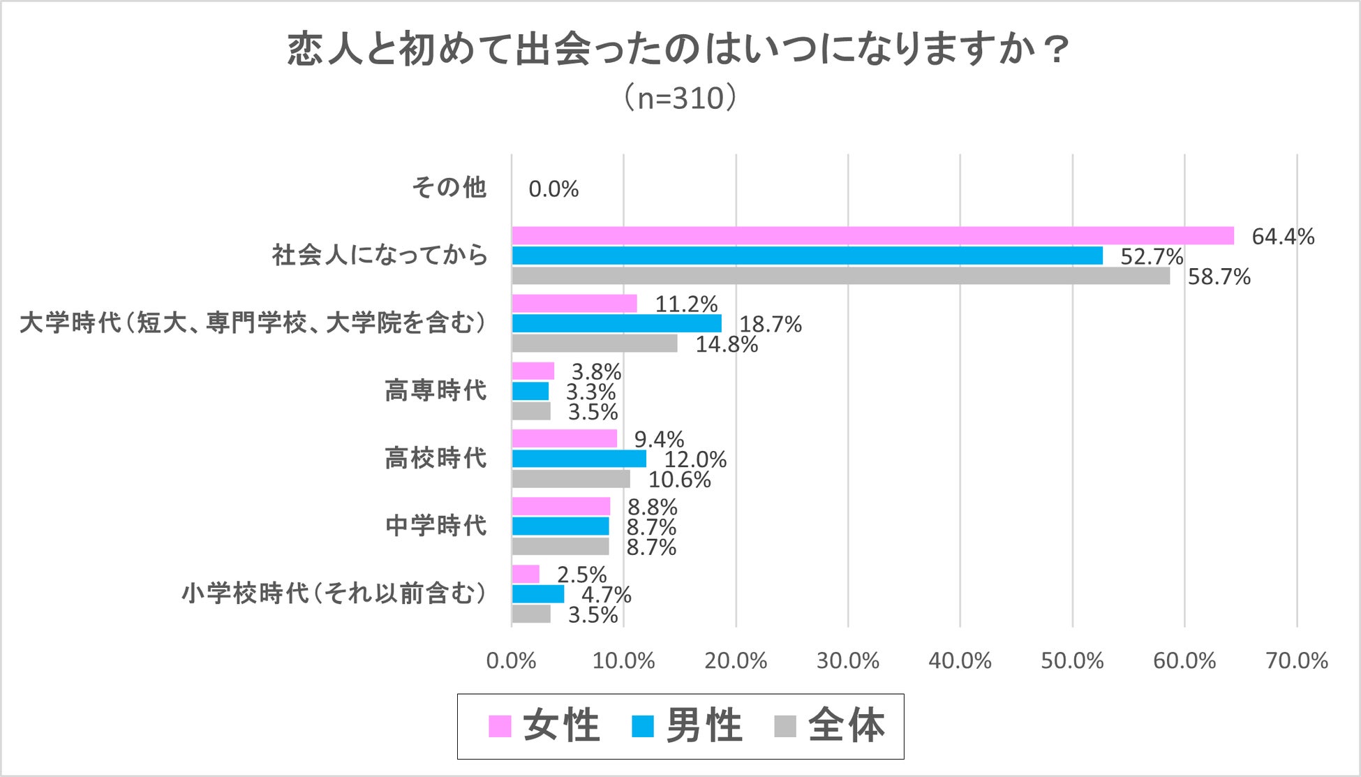 最も多かった回答は、「社会人になってから」で、全体で58.7%、男性が52.7%、女性が64.4%という結果となりました。続いて多かった回答は、「大学時代(短大、専門学校、大学院含む)」という回答で、全体で14.8%、男性18.7%、女性11.2%という結果となりました。そして3番目は、「高校時代」で全体10.6%、男性12.0%、女性9.4%という結果で、続いて4番目は「中学校時代」で、全体で8.7%、男性8.7%、女性、8.8%という結果で、男女ほぼ同割合という結果となりました。そして「小学校時代」「高専時代」が全体では、それぞれ3.5%という結果となりました。