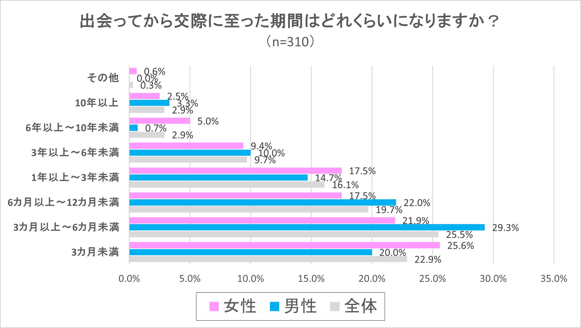 全体で22.9%、男性20.0%、女性25.6%という結果となりました。そして3番目は「6カ月以上12カ月未満」という回答で、全体で19.7%、男性22.0%、女性17.5%という結果となりました。これら3つの回答を合算すると全体で68.1%という割合となり、約7割近い男女が出会ってから1年未満という期間でお付き合いを開始しているという結果となりました。