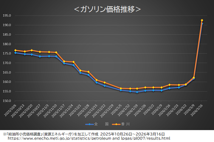 国内のガソリン価格は、2025年12月に廃止された旧暫定税率(25.1円)の効果もあり、150円台を安定的に推移しておりました。しかし、イラン情勢の悪化など中東の地政学リスクの高まりにより原油価格が上昇し、ガソリン価格は直近で大きく急騰しました。*3 今後も高値水準での推移が見込まれており、家計や企業活動への影響が懸念されています。特に香川県を含む四国エリアでは、自動車が生活に欠かせない移動手段であるため、ガソリン価格の上昇が日常生活の負担に直結しやすい状況にあります。